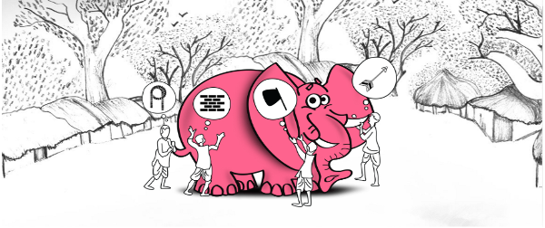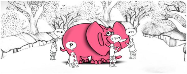 Each blind man touches a part of the elephant and shares with excitement. One touches the back of the elephant and says “it’s like a huge wall”. The second at its feet says, “ it’s like a tree trunk!” The third one touches its sharp tusk and screams, “it’s like a fine sharp arrow!! ”